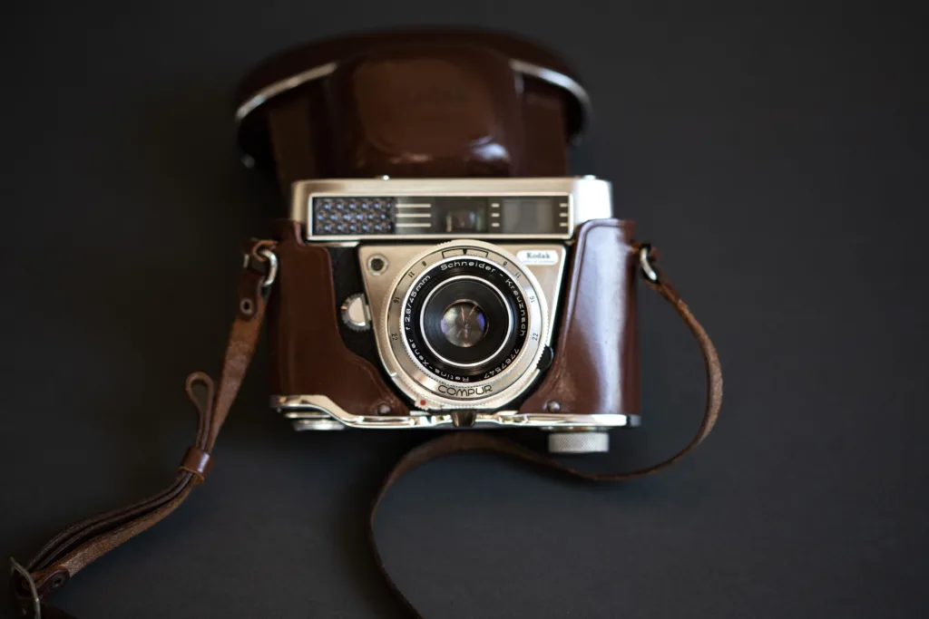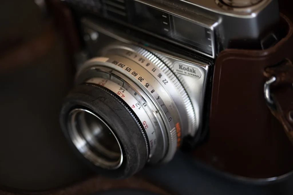 Uses 35mm film and has a built in Retina-Xenar f2.8/45mm lens.